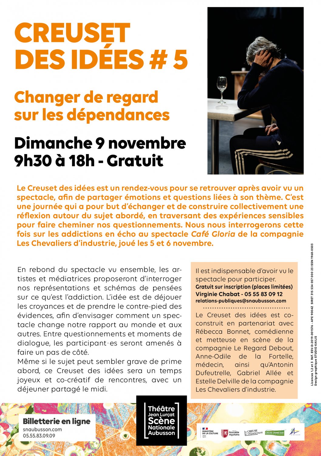 Le Creuset des idées est un rendez-vous pour se retrouver après avoir vu un spectacle, afin de partager émotions et questions liées à son thème. C'est une journée qui a pour but d'échanger et de construire collectivement une réflexion autour du sujet abordé, en traversant des expériences sensibles pour faire cheminer nos questionnements. Nous nous interrogerons cette fois sur les addictions en écho au spectacle Café Gloria