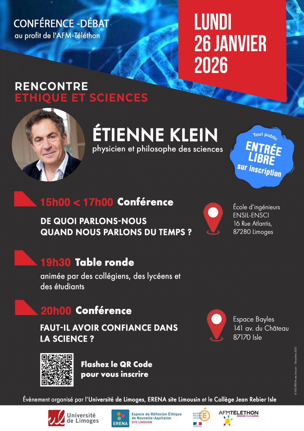Lundi 26 janvier 2026, le physicien et philosophe des sciences Étienne Klein sera l'invité d'honneur pour une journée de conférences et d'échanges. À 15h, il interviendra à l’ENSIL-ENSCI de Limoges sur le thème « De quoi parlons-nous quand nous parlons du temps ? », et sera suivie d'une discussion animée par Geneviève Feuillade et le Dr Maryse Fiorenza-Gasq.